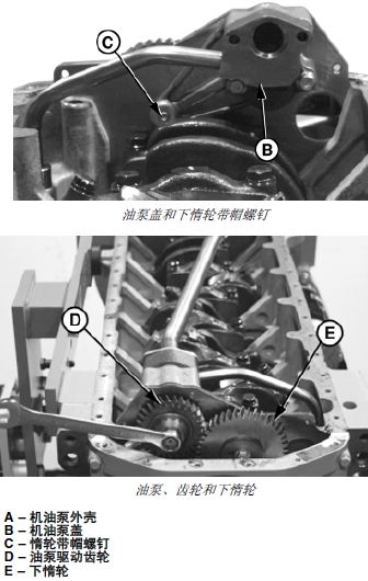注意: 此步驟用于在未拆卸正時齒輪蓋的情況下安裝機油泵。如果從John Deere約翰迪爾強鹿柴油發(fā)動機上拆下正時齒輪蓋,請參見第 050 章“安裝和正時平衡軸(四缸John Deere約翰迪爾強鹿柴油發(fā)動機)”部分。