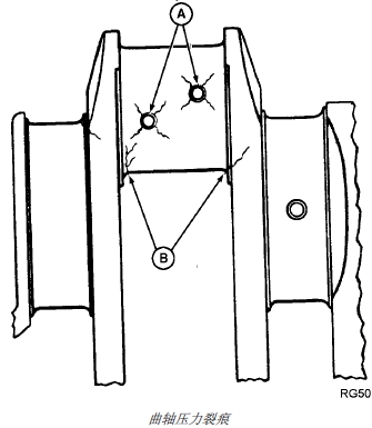 7. 仔細(xì)檢查曲軸在連桿軸頸油孔和軸頸圓角處 (B) 是否有裂痕。如果發(fā)現(xiàn)裂紋,需更換曲軸。