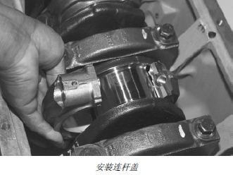 10. 用新帶帽螺釘安裝帶軸瓦的連桿蓋。(有關(guān)安裝和擰緊連桿帶帽螺釘?shù)男畔ⅲ垍⒁姷?030 章的“安裝活塞和連桿”部分。)
