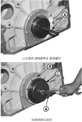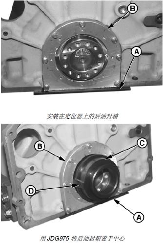 3. 將 JDG975 正時(shí)齒輪室蓋/ 后油封箱定位器 (C) 較大的一端安裝曲軸后凸緣上,錐形定位器 (D) 應(yīng)位于時(shí)鐘 3 點(diǎn)和 9 點(diǎn)的位置。