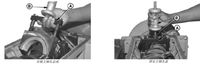 3. 使用 JDG996 主軸瓦蓋拉拔器/ 安裝器 (A) 和滑錘(B),按照對應(yīng)的順序?qū)R凹槽和定位片,以安裝軸瓦蓋和軸瓦。一定要在擰緊帶帽螺釘前將軸瓦定位片對準(zhǔn)正確的位置。