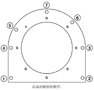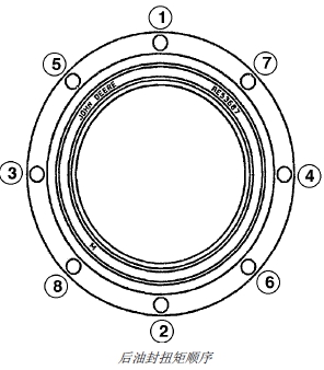 注意: 為了與曲軸箱對準(zhǔn),在安裝后油封箱前先應(yīng)從油盤襯墊底部清潔所有的墊圈材料和密封劑。曲軸凸緣的外徑和后油封箱的內(nèi)徑一定不可有刻痕和毛刺。用砂布修復(fù)磨損表面,并將表面徹底清潔干凈。