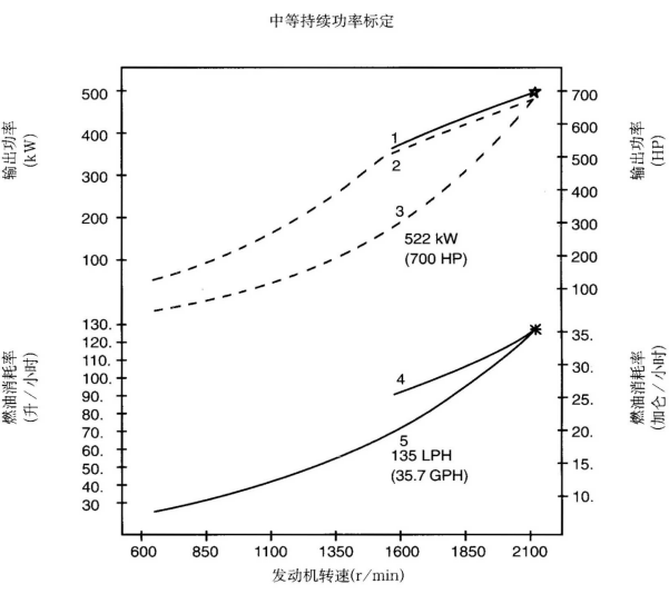 標(biāo)定條件:功率標(biāo)定是基于ISO8665和SAE J1228標(biāo)準(zhǔn)規(guī)定的條件:大氣壓力100kPa (29.612英寸汞柱),環(huán)境溫度為25℃(77°F),相對(duì)濕度為30%。螺旋槳軸功率為按97%扣除齒輪箱損失后的凈功率。燃油消耗是基于使用16℃(60°F)比重為838.9g/l(7.001磅/加侖),LHV為42780kJ/kg(18390Btu/lb)的35°API燃油。 13. 制動(dòng)功率 kW(HP) 4. 軸功率對(duì)應(yīng)的燃油消耗 14. 扣除齒輪箱損失后的軸功率 kW(HP) 5. 螺旋槳推進(jìn)曲線對(duì)應(yīng)的燃油消耗 15. 螺旋槳推進(jìn)曲線 中等持續(xù)功率:允許發(fā)動(dòng)機(jī)在變負(fù)荷工況下連續(xù)使用,每12個(gè)小時(shí)連續(xù)運(yùn)轉(zhuǎn)期間內(nèi),其全負(fù)荷運(yùn)轉(zhuǎn)時(shí)間不超過6小時(shí)。降功率運(yùn)轉(zhuǎn)必須在最大標(biāo)定轉(zhuǎn)速以下200rpm范圍內(nèi)。該功率標(biāo)定符合ISO3046中的“燃油限止功率標(biāo)定”,用于每年運(yùn)行時(shí)間不超過3000小時(shí)的船舶。 * 對(duì)非LTA發(fā)動(dòng)機(jī),其燃油耗高1-3%。 | ||||||