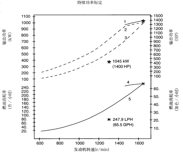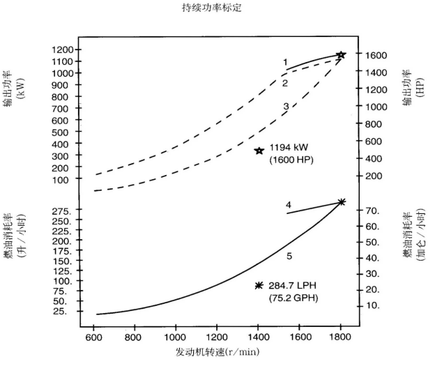 標(biāo)定條件:功率標(biāo)定是基于ISO8665標(biāo)準(zhǔn)規(guī)定的條件:大氣壓力為100kPa (29.612英寸汞柱),環(huán)境溫度為25℃(77°F),相對濕度為30%。螺旋槳軸功率為按97%扣除齒輪箱損失后的凈功率。燃油消耗是基于使用比重為838.9g/l(7.001磅/加侖),LHV為42780kJ/kW(18390Btu/lb)的35°API燃油。 1. 制動功率 kW(HP) 4. 軸功率對應(yīng)的燃油消耗 2. 扣除齒輪箱損失后的軸功率 kW(HP) 5. 螺旋槳推進(jìn)曲線對應(yīng)的燃油消耗 3. 螺旋槳推進(jìn)曲線 持續(xù)功率:這種功率標(biāo)定的康明斯發(fā)動機(jī)允許在全負(fù)荷工況下連續(xù)不斷地使用。這種功率為ISO3046標(biāo)準(zhǔn)功率 * 對非LTA康明斯發(fā)動機(jī),其燃油耗高1-3%。 | ||||||