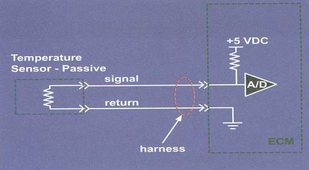下圖所示為溫度傳感器的工作原理。隨著溫度的升高,熱敏電阻值降低,從而使信號(hào)電壓降低,根據(jù)溫度傳感器的工作原理,可以用檢查熱敏電阻阻值的方法檢查溫度傳感器,通過(guò)對(duì)比實(shí)際測(cè)量所得的電阻值和參數(shù)表中的電阻值,即可判斷傳感器是否正常工作。