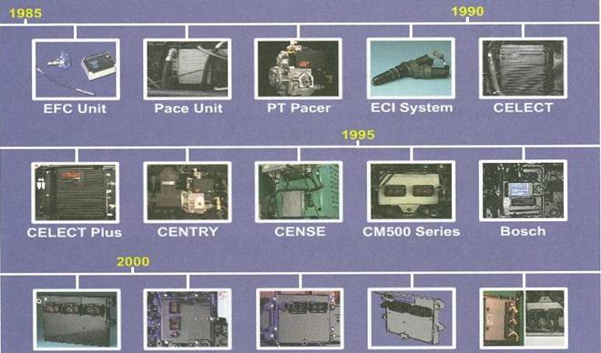 由于電控柴油機(jī)燃油系統(tǒng)的多樣性,康明斯有多種不同型號(hào)的ECU(M)用在不同型號(hào)的發(fā)動(dòng)機(jī)上。下圖列出了不同年代在康明斯發(fā)動(dòng)機(jī)上使用的ECU(M)。這些ECU(M)具有不同的零件號(hào),在訂購(gòu)時(shí)請(qǐng)注意。