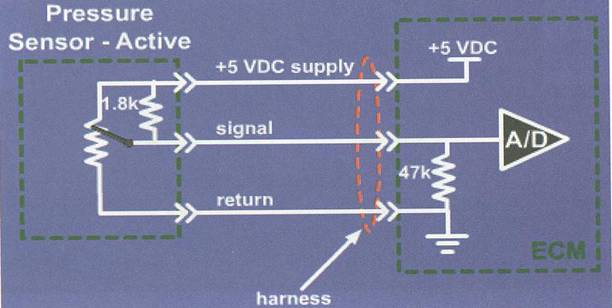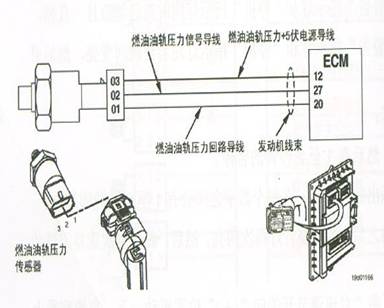 康明斯發(fā)動(dòng)機(jī)上使用的壓力傳感器有兩種不同的工作原理,一種是電容式壓力傳感器,另外一種是壓電晶體式。兩種傳感器均為三線式,兩根電源線向傳感器提供5伏的工作電壓,一根信號(hào)線向ECU(M)提供壓力信號(hào)電壓。