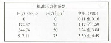 下表為一個(gè)機(jī)油壓力傳感器在不同的機(jī)油壓力輸出信號(hào)電壓值。具體在測(cè)量壓力傳感器時(shí)請(qǐng)參考電路圖上壓力傳感器參數(shù)表。