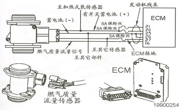 電子控制模塊(ECU(M))通過(guò)GMFS來(lái)測(cè)量從燃料供應(yīng)管輸送到發(fā)動(dòng)機(jī)的燃?xì)饬俊MFS通過(guò)蓄電池供電。燃?xì)赓|(zhì)量流量傳感器是一個(gè)熱絲風(fēng)速計(jì),它通過(guò)計(jì)量將電熱絲維持在恒定溫度所需要的電功率確定燃?xì)獾牧髁?。?dāng)有更多的燃?xì)饬鹘?jīng)流量傳感器的電熱絲時(shí),電熱絲就需要更大的電功率來(lái)維持其保持在恒定的溫度。