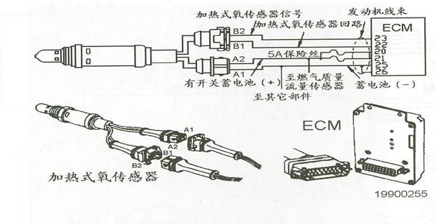 氧傳感器用來(lái)檢測(cè)發(fā)動(dòng)機(jī)廢氣中氧含量,并發(fā)信號(hào)給ECU(M)。電子控制模塊(ECU(M))通過(guò)HOS來(lái)計(jì)算發(fā)動(dòng)機(jī)運(yùn)行時(shí)的實(shí)際空燃比,并根據(jù)運(yùn)算結(jié)果來(lái)調(diào)整燃料的供給,從而獲得最佳的排放水平