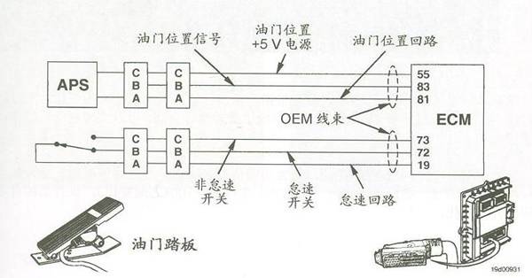 如圖所示,油門(mén)內(nèi)部由一個(gè)電位計(jì)(可變電阻)和一個(gè)單刀雙擲開(kāi)關(guān)組成。單刀雙擲開(kāi)關(guān)的作用是向ECU(M)提供怠速與非怠速的信號(hào),所以此開(kāi)關(guān)也叫怠速校驗(yàn)開(kāi)關(guān)。在司機(jī)踩與不踩油門(mén)時(shí),此開(kāi)關(guān)分別處在非怠速與怠速兩個(gè)不同的接通位置,ECU(M)即可通過(guò)此開(kāi)關(guān)的接通位置判斷司機(jī)是否已踩下油門(mén)。