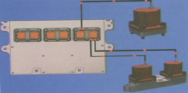 ECU(M)通過(guò)輸入設(shè)備輸入的參數(shù),通過(guò)內(nèi)部程序的計(jì)算,向各輸出設(shè)備輸出控制指令,由于電控柴油系統(tǒng)的多樣性,各種不同的電控燃油系統(tǒng),其所具有的執(zhí)行元件各不相同,以系統(tǒng)最主要的輸出設(shè)備,實(shí)現(xiàn)噴油量和噴油正時(shí)控制的執(zhí)行元件為例。中馬力共軌系統(tǒng)通過(guò)噴油器來(lái)直接實(shí)現(xiàn)對(duì)噴油量和噴油正時(shí)的控制,而有些燃油系統(tǒng)通過(guò)單個(gè)電磁閥實(shí)現(xiàn)所有六個(gè)缸的控制。