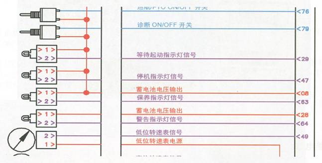 電路圖中的顏色:康明斯原裝的電路圖為彩色圖,圖中線路總共有五種顏色,分別是紅色、藍(lán)色、黑色、紫色、和綠色。紅色代表系統(tǒng)供電電路的火線,包括電瓶向ECU(M)的供電電路火線和ECU(M)向輸入輸出設(shè)備供電電路的火線;藍(lán)色代表輸入設(shè)備向ECU(M)輸入信號(hào)的信號(hào)電路,包括各種開(kāi)關(guān)和傳感器及油門(mén)的輸出信號(hào)線;黑色代表供電電路的地線,包括電瓶回路的地線和ECU(M)向輸入輸出設(shè)備供電的地線;紫色代表ECU(M)向輸出設(shè)備提供控制信號(hào)的控制信號(hào)線;綠色為數(shù)據(jù)通信線路。