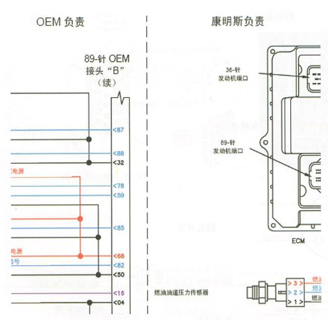 康明斯提供的發(fā)動(dòng)機(jī)安裝到主機(jī)廠設(shè)備上,需要主機(jī)廠完成一系列的接線,其中包括ECU(M)的供電電路、發(fā)動(dòng)機(jī)的啟動(dòng)電路、油門(mén)電路、指示燈和控制開(kāi)關(guān)電路等等。在康明斯電路圖中通過(guò)一根虛線將整個(gè)電路圖一分為二,圖中標(biāo)明左邊電路為OEM(主機(jī)廠)負(fù)責(zé),右邊電路為康明斯負(fù)責(zé),即左邊電路由主機(jī)廠負(fù)責(zé)安裝,右邊電路為發(fā)動(dòng)機(jī)的出廠狀態(tài)。