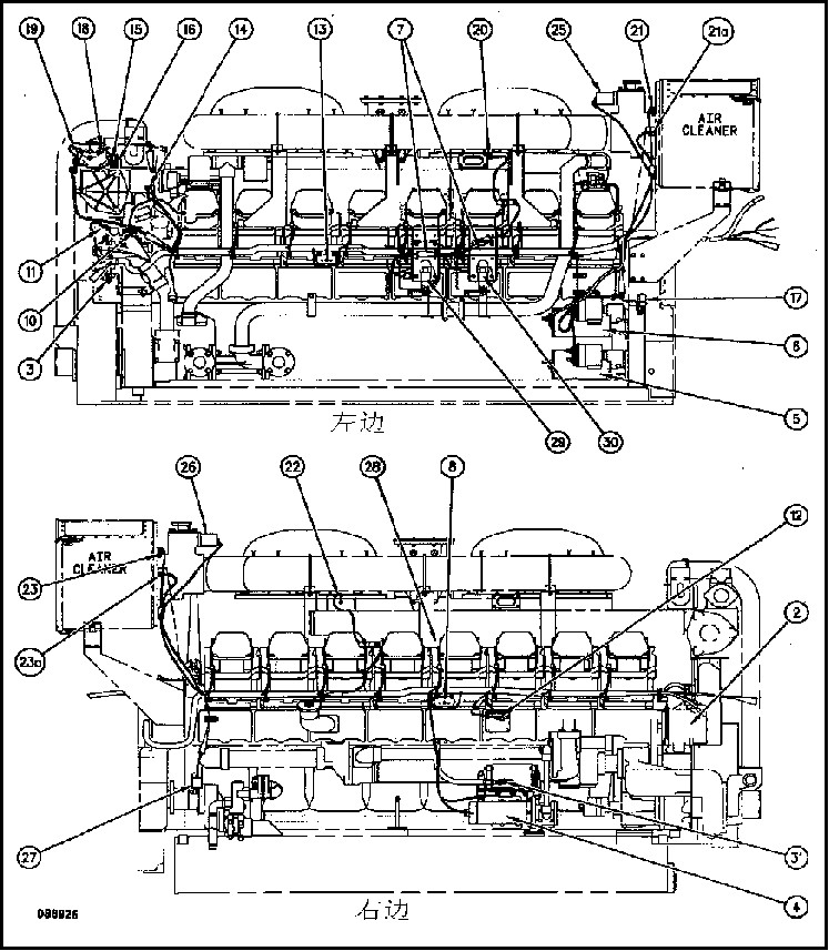 2.充電機 3.發(fā)動機電控器,4.預潤滑馬達, 5.起動馬達,6.起動馬達 7.電阻器,8.充電機斷路器.10.后冷卻器溫度傳感器.11.大氣壓力傳感器.12.曲軸箱壓力傳感器.13.發(fā)動機電控器(ECM)斷路器.14.發(fā)動機冷卻液溫度傳感器.15. 已過濾機油壓力傳感器.16. 未過濾機油壓力傳感器.17.發(fā)動機正時\轉速傳感器.18.燃油濾清器壓力傳感器(已過濾).19.燃油濾清器壓力傳感器(未過濾).20.左排氣溫度傳感器.21.左渦輪增壓進氣壓力傳感器.22.右排氣溫度傳感器.23.右渦輪增壓進氣壓力傳感器.24.渦輪增壓氣輸入壓力傳感器.25.空氣關斷電磁閥(左,選配件).26.空氣關斷電磁閥(右,選配件).28.噴油器電磁閥 29.輔助起動電磁閥.30.輔助起動電磁閥.31.預潤滑壓力開關(選配件).