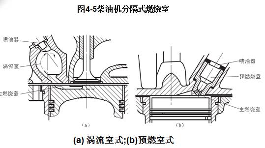 分隔式燃燒室由兩部分組成:一部分位于活塞頂與汽缸蓋底面之間,稱為主燃燒室;另一部分在汽缸蓋中,稱為副燃燒室。兩部分之間有一個(gè)或幾個(gè)孔道相連。分隔式燃燒室常見的形式有渦流室式和預(yù)燃室式兩種,如圖4-5所示。