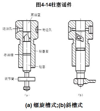 柱塞偶件是產(chǎn)生高壓油的壓油元件,其結(jié)構(gòu)如圖4-14所示。柱塞套裝在泵體座孔內(nèi)固定不動,柱塞由凸輪驅(qū)動,在柱塞套內(nèi)上下往復(fù)運動。此外,可繞自身軸線在一定角度轉(zhuǎn)動。柱塞頭部的圓柱表面銑有螺旋槽或斜槽,并利用直槽或中心孔(徑向孔和軸向孔)使槽與柱塞上方泵腔相通。柱塞套上部開有一個進油和回油用的徑向小孔與泵體上的低壓油腔相通,有的則開有兩個徑向小孔,兩個小孔的中心線可以在一個水平線上,也可不在同一水平線上,上面的為進油孔,下面的為回油孔。柱塞彈簧通過彈簧座將柱塞推向下方,使柱塞下端與滾輪式挺桿接觸,并使挺桿中的滾輪與下凸輪接觸。
