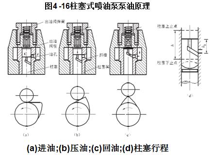 柱塞繼續(xù)上移,當(dāng)柱塞上的斜槽與油孔開始接通時,泵腔內(nèi)的燃油便經(jīng)柱塞上的直槽、斜槽和油孔流向低壓油腔。這時,泵腔中油壓迅速下降,出油閥在彈簧壓力作用下立即復(fù)位,噴油泵供油立即停止。此后柱塞仍繼續(xù)上行,直到上止點為止,但不再泵油(如圖4-16 (c)所示)。