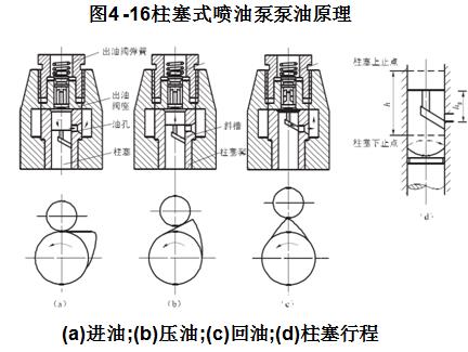 ②CAT柴油機泵油原理。分泵的泵油原理如圖4-16所示。當(dāng)柱塞自上止點下移時,其上方泵腔容積增大,產(chǎn)生真空度;當(dāng)柱塞上端面低于柱塞套上進油孔上緣時,燃油自低壓油腔經(jīng)油孔被吸入并充滿泵腔及柱塞頭部凹穴部分,直至下止點,完成進油過程(如圖4-16 (a)所示)。