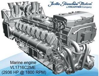新型 Isotta 推進發(fā)動機 V 1712 C2 MLH 船用柴油發(fā)動機,四沖程循環(huán)柴油發(fā)動機,博世高壓共軌燃油噴射系統(tǒng),帶廢氣渦輪增壓器和管式原水/增壓空氣中冷的增壓系統(tǒng),發(fā)動機冷卻系統(tǒng)設計用于淡水/海水龍骨冷卻型熱交換器,帶有集成集水箱和恒溫控制,絕熱排氣歧管。