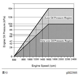 74 故障排除章節(jié)RENR5033-02結(jié)果:• OK-事件發(fā)生是由于正常的CAT發(fā)動機(jī)操作。清除記錄的事件,恢復(fù)CAT發(fā)動機(jī)運(yùn)行。停止。• 不行-事件未發(fā)生。繼續(xù)進(jìn)行測試步驟2。測試步驟2.檢查空氣后冷器(ATTAC)如果ATAAC有阻礙,進(jìn)氣歧管空氣溫度會提高。檢查ATAAC的翅片有無阻礙。期望結(jié)果:ATAAC的翅片被阻礙。結(jié)果:• OK-ATAAC的翅片被阻礙。修理:清潔ATAAC的翅片。清除事件代碼?;謴?fù)CAT發(fā)動機(jī)運(yùn)行。停止。• 不行-ATAAC的翅片沒有阻礙。繼續(xù)進(jìn)行測試步驟3。測試步驟3.檢查大氣壓力傳感器的5伏電源如果大氣壓力傳感器沒有被5伏電源供電,傳感器輸出會浮動到指示高大氣壓力的數(shù)值。這被ECM理解為高海拔環(huán)境條件。ECM獲得錯(cuò)誤的海拔值,降低CAT發(fā)動機(jī)功率。A.確認(rèn)開關(guān)處于ON位置。B.測量大氣壓力傳感器線束接頭的5伏電源的值。期望結(jié)果:電壓約5伏。結(jié)果:• OK-大氣壓力傳感器供電電壓約5伏。該事件沒有進(jìn)一步故障排除程序。清除記錄的事件,恢復(fù)CAT發(fā)動機(jī)運(yùn)行。停止。不行-大氣壓力傳感器供電電壓不是5伏左右。大氣壓力傳感器和ECM之間的5伏電源線存在問題。修理:確認(rèn)電線問題,進(jìn)行必要修理。當(dāng)5伏電源向大氣壓力傳感器供電時(shí),清除事件代碼,恢復(fù)CAT發(fā)動機(jī)運(yùn)行。停止。i02490780E360機(jī)油壓力低SMCS代碼: 1348-038-LP生成該代碼的條件:CAT電子控制模塊(ECM)檢測到以下情況:360(1)• CAT發(fā)動機(jī)機(jī)油壓力處于圖10中的“ 機(jī)油壓力低壓范圍”達(dá)到8秒。• 在曲軸起轉(zhuǎn)結(jié)束后,CAT發(fā)動機(jī)運(yùn)行至少10秒。360(2)• CAT發(fā)動機(jī)機(jī)油壓力處于圖10中的“ 機(jī)油壓力非常低范圍” 達(dá)到4秒。• 在曲軸起轉(zhuǎn)結(jié)束后,CAT發(fā)動機(jī)運(yùn)行至少10秒。