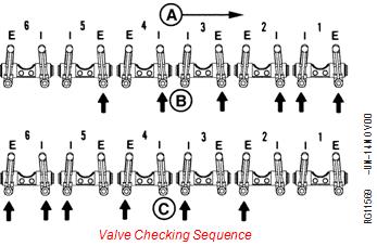 規(guī)格搖臂蓋到托架蓋螺釘扭矩……8牛•米(5.9磅-英尺)閥門檢查順序A-強鹿約翰迪爾柴油發(fā)動機前部B-編號。1缸“TDC”C-No。6缸“TDC”強鹿約翰迪爾柴油發(fā)動機D-前部