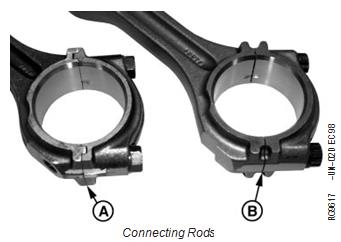 早期的強鹿約翰迪爾John Deere柴油發(fā)動機在連桿和蓋(A)之間有傳統(tǒng)的榫槽。后來的強鹿約翰迪爾John Deere柴油發(fā)動機有精密接頭 桿和蓋(B)。