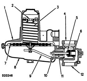 (1)彈簧側(cè)室(2)調(diào)節(jié)螺絲(3)彈簧(4)出口(5)閥盤(6)主噴嘴(7)主通風(fēng)口(8)控制桿側(cè)室(9)控制桿(10)鎖銷(11)閥桿(12)進(jìn)氣口