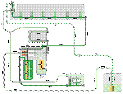 VOLVO PENTA系列柴油機的燃油系統(tǒng)為電噴,其包括供應和噴射兩個系統(tǒng)。供應油路由粗濾器(有油水分離功能)、ECU泠卻管路、隨動輸油泵、手動輸油泵、精濾器、缸頭總油道組成。噴射系統(tǒng)由噴油凸輪、油頭泵組、電磁閥組成。因為氣體的可壓縮性,如果在高壓油路中混入空氣則會產生氣阻,從而導致噴油不正常以至于造成工作轉速不穩(wěn)定,影響柴油機的使用壽命。故在每次起動之前必須壓動手動輸油泵至壓不動為止,以確保排盡高壓油路中的空氣。VOLVO PENTA系列柴油機燃油系統(tǒng)組件中精密是油頭泵組,特別是燃油噴嘴,如果燃油中有水會導致噴嘴銹蝕導致油嘴損壞,故在燃油系統(tǒng)中安裝有油水分離功能的粗濾器。在機器使用一段時間后要檢查粗濾器下部的油杯內是否有水,若有應及時排除,以保證燃油系統(tǒng)的正常工作。VOLVO PENTA系列柴油機的柴油精濾器正常使用為400小時,視柴油質量可適當提前。