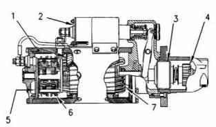 電磁閥(2)在空心氣缸周圍有繞組(一組或兩組)。彈簧加載的柱塞位于氣缸內(nèi)。柱塞可以前后移動。當(dāng)啟動開關(guān)閉合,電流通過繞組輸送時(shí),產(chǎn)生磁場(1)。磁場(1)將柱塞在氣缸中向前拉。這會移動換檔桿,使小齒輪驅(qū)動齒輪與齒圈接合。然后,柱塞前端通過電磁閥(2)的蓄電池和馬達(dá)端子進(jìn)行接觸。接下來,起動馬達(dá)開始轉(zhuǎn)動發(fā)動機(jī)的飛輪。當(dāng)起動開關(guān)打開時(shí),電流不再流過繞組。彈簧現(xiàn)在將柱塞推回到原始位置。同時(shí),彈簧使小齒輪遠(yuǎn)離飛輪。