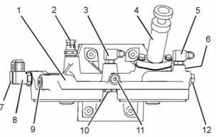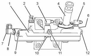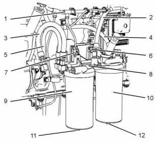 2. 將新的O形密封圈安裝到塞(9)、(11)和(12)上。將塞子安裝到燃油濾清器底座(1)上。將塞(9)擰緊至41 N•m(30 lb ft)的扭矩。將塞子(11)和(12)擰緊至15 N•m(11 lb ft)的扭矩。