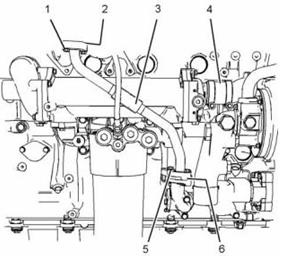 2. 松開軟管卡箍并向前滑動(dòng)軟管(4),以便從發(fā)動(dòng)機(jī)機(jī)油冷卻器上斷開軟管。