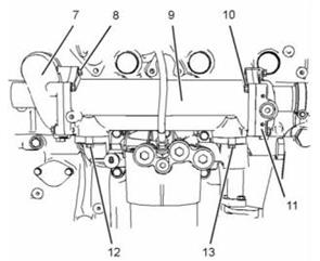 8. 安裝螺栓(12)和(13)。將螺栓擰緊至28 N•m(21 lb ft)的扭矩。