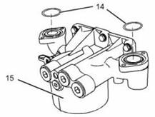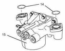 11. 從卡特C13珀金斯2206發(fā)動(dòng)機(jī)機(jī)油冷卻器機(jī)油濾清器底座(15)上拆下O形密封圈(14)。