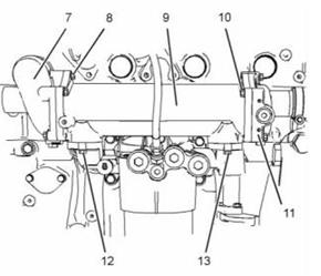 5. 將發(fā)動(dòng)機(jī)機(jī)油冷卻器(9)放置在發(fā)動(dòng)機(jī)機(jī)油濾清器底座上。