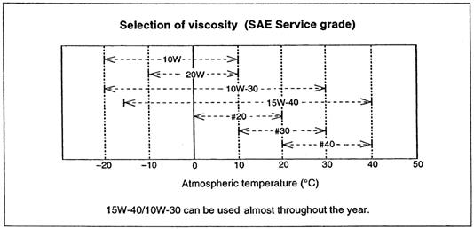 API 等級 CD 或CF(美國石油工業(yè)標(biāo)準(zhǔn))最高溫度在120℃以下使用,更換周期為250小時(shí)。機(jī)油溫度越高,機(jī)油越??;同時(shí)溫度也影響機(jī)油的使用壽命。TBN值說明,小于2需更換.SAE(粘度等級) 汽車工程協(xié)會標(biāo)準(zhǔn),根據(jù)環(huán)境溫度選擇,夏季在中國大多數(shù)地區(qū)可使用15W-40的機(jī)油。