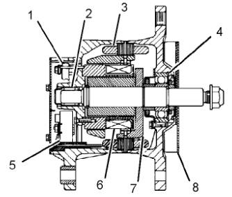 (1)調(diào)壓器 (2)轉(zhuǎn)子軸承 (3)定子繞組 (4)滾珠軸承 (5)整流橋 (6)勵(lì)磁繞組 (7)轉(zhuǎn)子組件 (8)風(fēng)扇