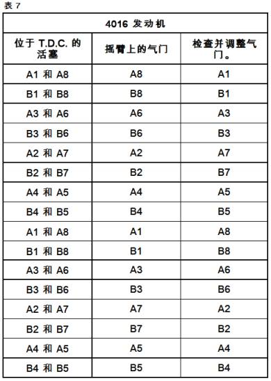 1拆下調(diào)整螺釘(1)。2拆下?lián)u臂室蓋(2)。3拆下接頭(未顯示)。4對其余的搖臂室蓋重復(fù)步驟1至3。對于4016·61 TRG發(fā)動機(jī)按表7中所示的順序調(diào)整氣門間隙。