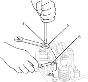 a松開進(jìn)氣門搖臂上的鎖緊螺母(9)。