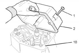 12確保搖臂室蓋(2)清潔無損壞。確保搖臂底座 (10)的接合面清潔無損壞。