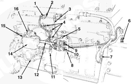 1油軌壓力傳感器,2燃油連接塊,3空燃比控制傳感器管,4保險絲 (5A),5系統(tǒng)接地接頭,6發(fā)動機轉(zhuǎn)速傳感器,7液壓機械式 STC 執(zhí)行器,8 OEM C5 和 C6 接頭支架,9 C5 接頭,10 C6 接頭,11發(fā)動機側(cè)數(shù)據(jù)通信接頭,12發(fā)動機線束,13燃油泵,14 ECM,15電子燃料控制閥,16燃油切斷閥,