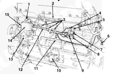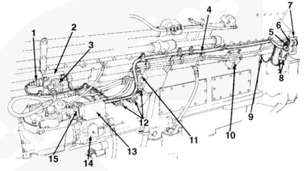 1油軌壓力傳感器,2燃油連接塊,3燃料切斷閥4發(fā)動機線束,5 C6 接頭,6 C5 接頭,7 OEM C5 和 C6 接頭支架,8發(fā)動機轉(zhuǎn)速傳感器,9系統(tǒng)接地接頭,10液壓機械式 STC 執(zhí)行器,11發(fā)動機側(cè)數(shù)據(jù)通信接頭,12保險絲 (5A),13 ECM,14燃油泵,15電子燃油控制閥。