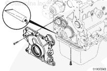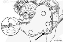 注: 安裝三個(gè)導(dǎo)向銷(xiāo)(零件號(hào) 3164977)以改進(jìn)前蓋和前油封與齒輪室和曲軸的對(duì)準(zhǔn)情況。