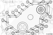 注: 安裝前齒輪室蓋前,先確保在缸體、油底殼與前齒輪室蓋的相互接合面上涂敷了密封膠(零件號(hào) 3164067)。