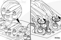 這種調(diào)節(jié)可從任一氣門設(shè)置標記開始。在插圖中,假設(shè) 1R-6R 或 1R-8R 標記已經(jīng)對準,且右排 1 號缸上的氣門已經(jīng)關(guān)閉,可以開始調(diào)整調(diào)節(jié)螺釘高度。