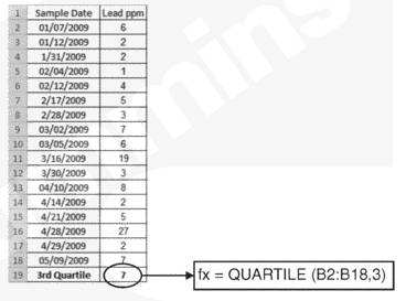 在 Mi c rosoft Ex c el® 中使用 “fx” 函數(shù)可以計(jì)算第三四分位數(shù)。此例中第三四分位數(shù)處的鉛含量數(shù)值為 7 ppm。