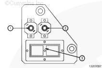 康明斯電子控制船用發(fā)動機配備了 2 個斷路器,位于發(fā)動機的 ECM 側(cè)。5 安斷路器 (1) 用于鑰匙開關(guān)控制的 ECM 電源,10 安斷路器 (2) 用于非鑰匙開關(guān)控制的面板電源。電路斷路器板上還安裝有 40-針 OEM 接頭(3)。