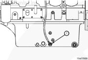 將 P 形夾(2)安裝到靠近 5 號凸輪軸隨動件蓋右下角的位置。安裝位于 6 號凸輪軸隨動件蓋上面的導(dǎo)線 P 形夾(3)和進(jìn)氣加熱器接頭支架(4)。連接將發(fā)動機(jī)線束連接到 OEM 線束上的數(shù)據(jù)通信接口(1)的接頭。