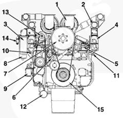 1渦輪增壓器進(jìn)口接頭,2 ATA 跨接接頭,3排氣口接頭,4發(fā)動(dòng)機(jī)轉(zhuǎn)速傳感器,5冷卻液出口接頭,6前吊耳,7飛輪殼,8曲軸箱通風(fēng)裝置,9風(fēng)扇輪轂,10充電機(jī),11冷卻液液位開關(guān)接頭,12組合式機(jī)油濾清器,13燃油進(jìn)口管接頭,14后吊耳。