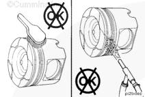 不要使用金屬刷。金屬刷會損壞活塞環(huán)槽。不要用玻璃噴丸清潔活塞環(huán)槽??墒褂昧慵枮?822735的胡桃殼或塑料噴丸對活塞環(huán)槽和活塞頂進行噴丸處理。用最小的有效壓力,并且不要長時間集中噴射一個區(qū)域。塑料噴丸的推薦工作壓力是276 kPa [40 psi]。